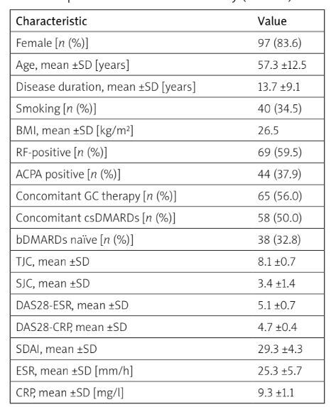 [i] ACPA – anti-citrullinated protein antibodies, bDMARDs – biologic disease-modifying antirheumatic drugs, BMI – body mass index, CRP – C-reactive protein, csDMARDs – conventional synthetic disease-modifying antirheumatic drugs, DAS28-CRP – Disease Activity Score 28 based on C-reactive protein level, DAS28-ESR – Disease Activity Score 28 based on erythrocyte sedimentation rate, ESR – erythrocyte sedimentation rate, GC – glucocorticosteroid, RA – rheumatoid arthritis, RF – rheumatoid factor, SJC – swollen joint count, SDAI – Simple Disease Activity Index, TJC – tender joint count.