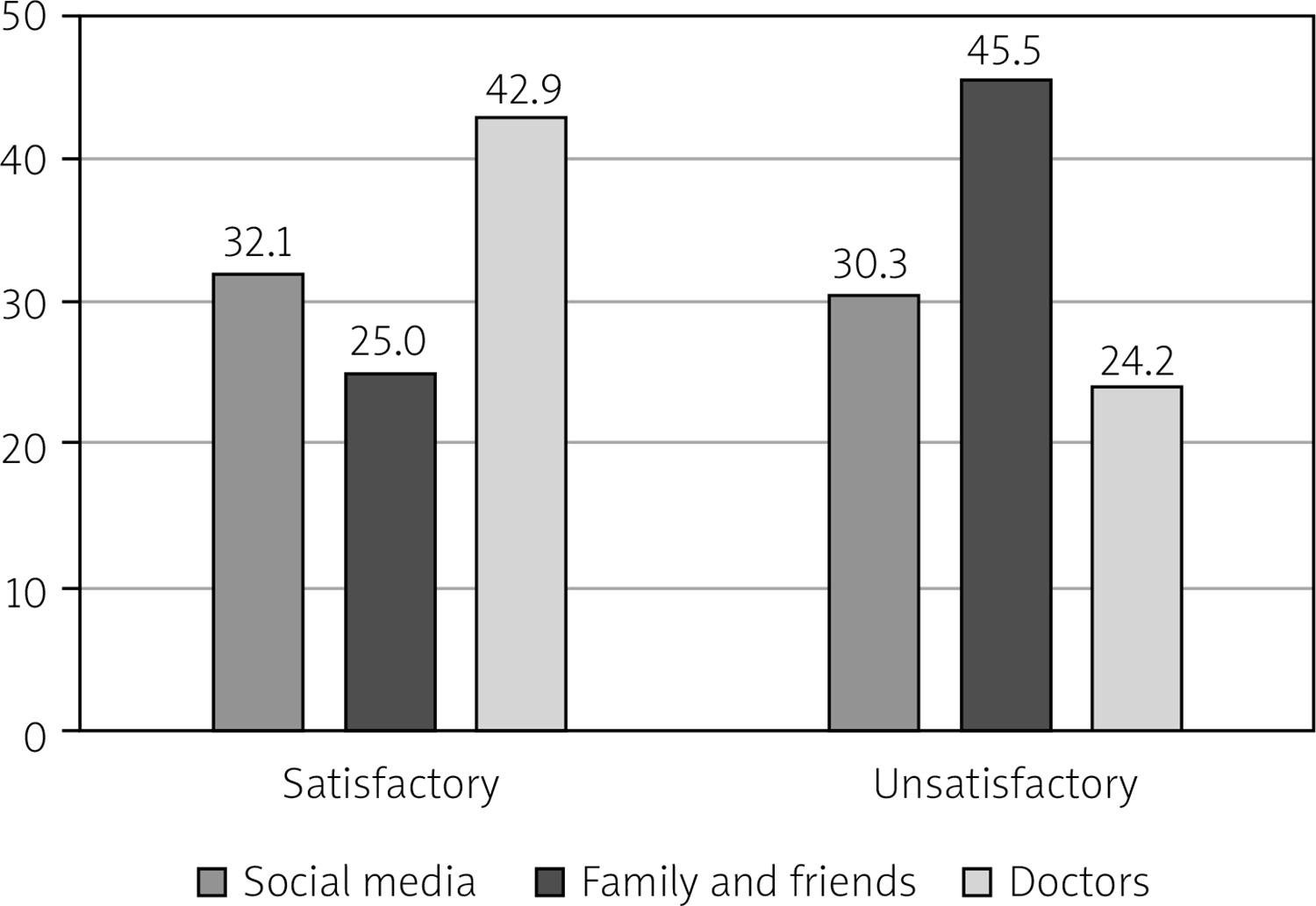 When examining sources of acquired information, doctors were cited by 42.9% of contributors with satisfactory knowledge. In contrast, in the other group, 45.5% stated that family and friends were the sources of such information. Social media were cited as the source of knowledge by one-third of the participants in the 2 groups (Fig. 2).
