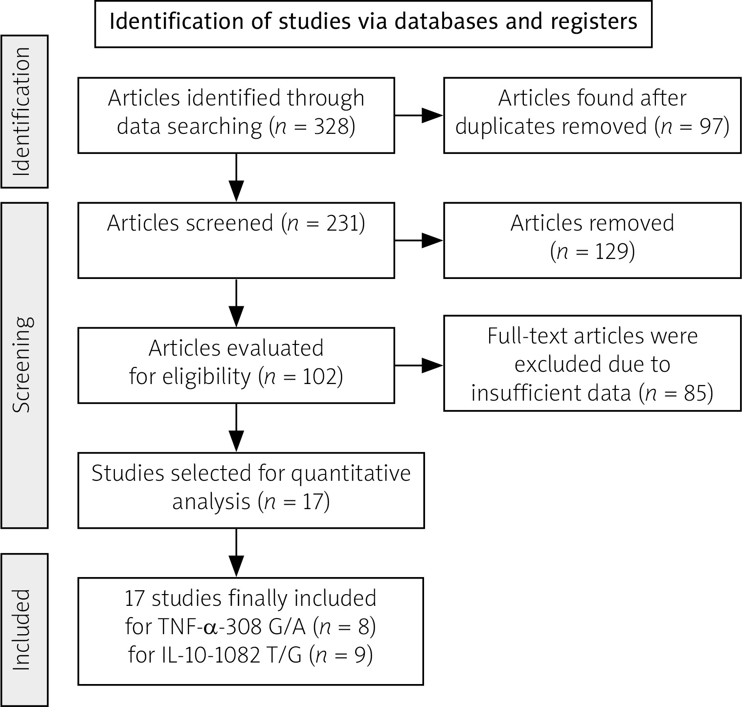 Flow chart of literature screening of investigated TNF-α rs1800629 and IL-10 rs1800896 gene polymorphisms.