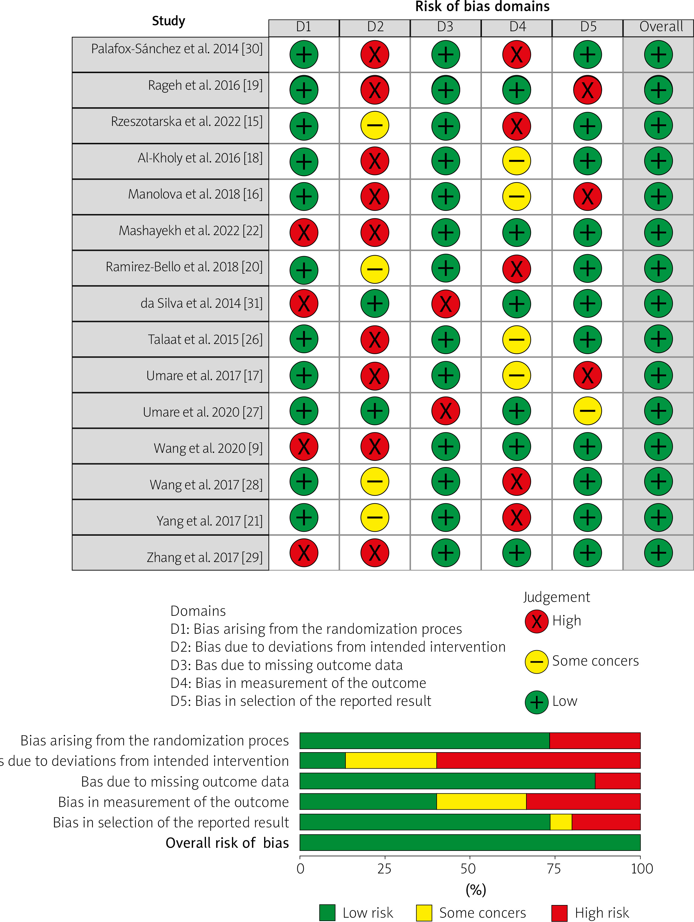 The p-value was calculated for the Hardy-Weinberg equilibrium (HWE) probability value. In addition, methodological biases in studies that met the inclusion criteria were evaluated using Newcastle-Ottawa Scale. It is essential to thoroughly assess the methodology and potential biases in the studies included in meta-analyses, considering that the risk of bias plays a critical role. Using Robvis software, we categorized these investigations according to the risk level, which included high risk, uncertain risk with some concerns, or low risk, indicating the degree of risk associated with each study.