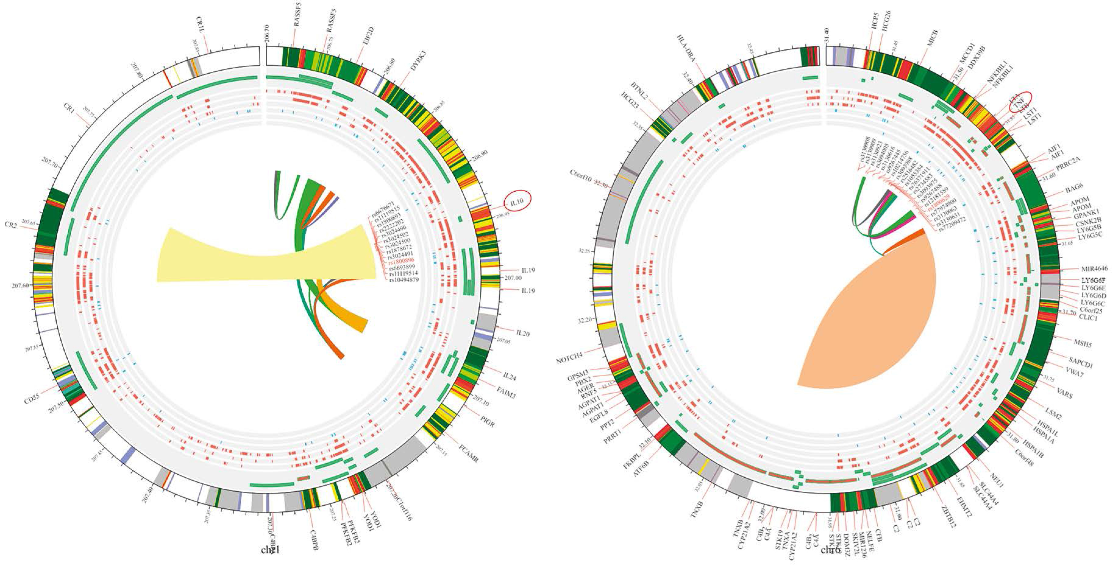 Circos plot illustrating the chromosomal interactions among the SNPs rs1800896 and rs1800629 and associated SNPs.
