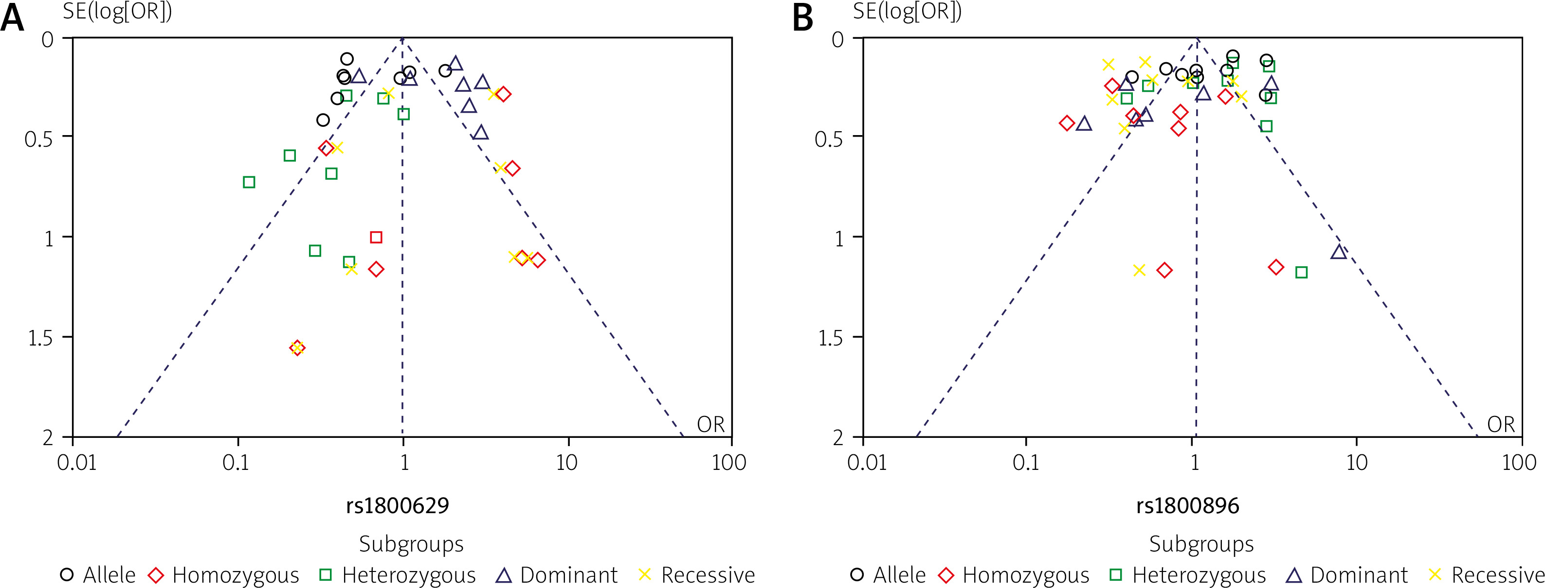 Funnel plots of publication bias in the relationships between TNF-α rs1800629 and IL-10 rs1800896 polymorphism and SLE risk.