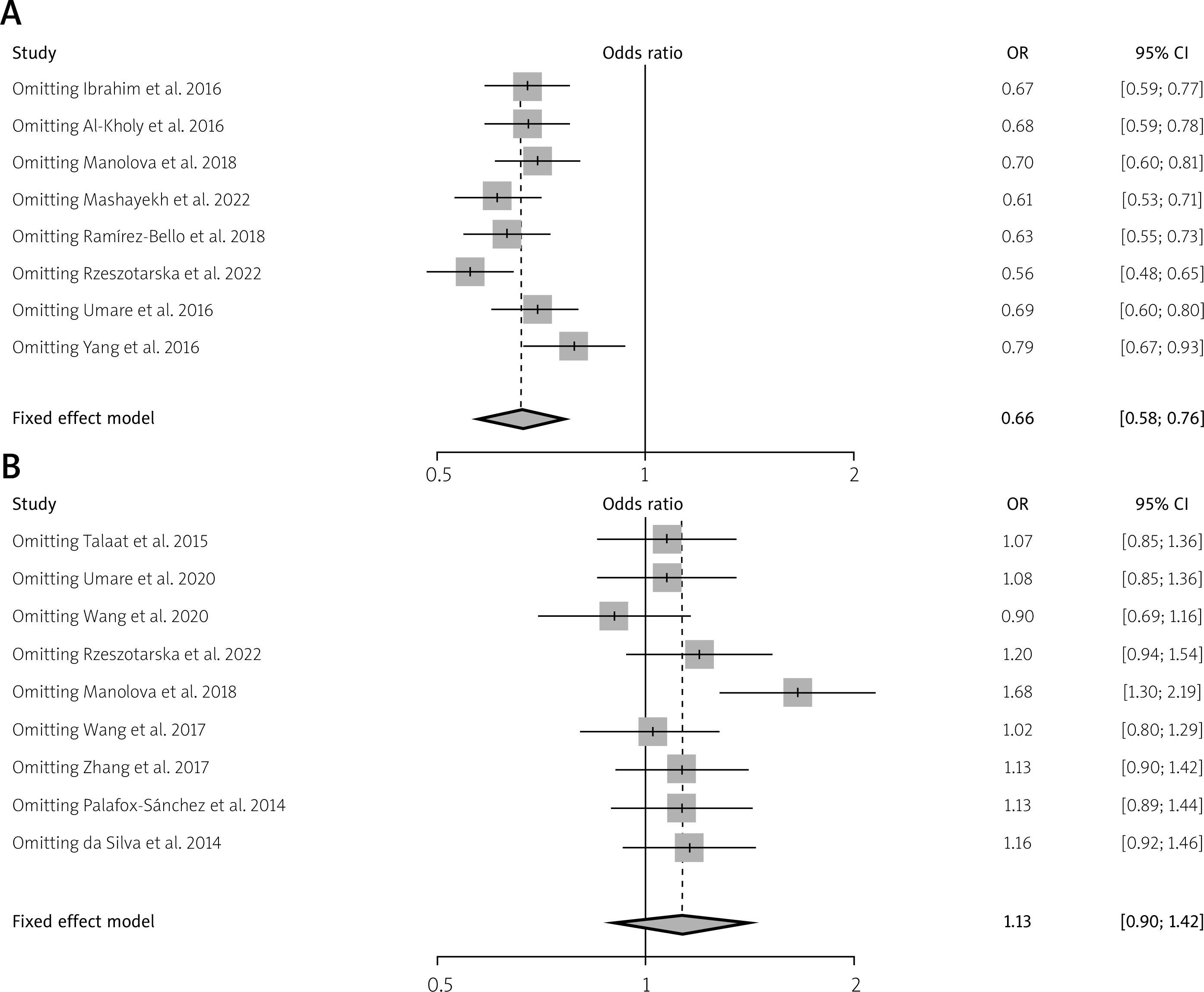 Sensitivity analysis of genetic variants of A) TNF-α (rs1800629) and B) IL-10 (rs1800896).