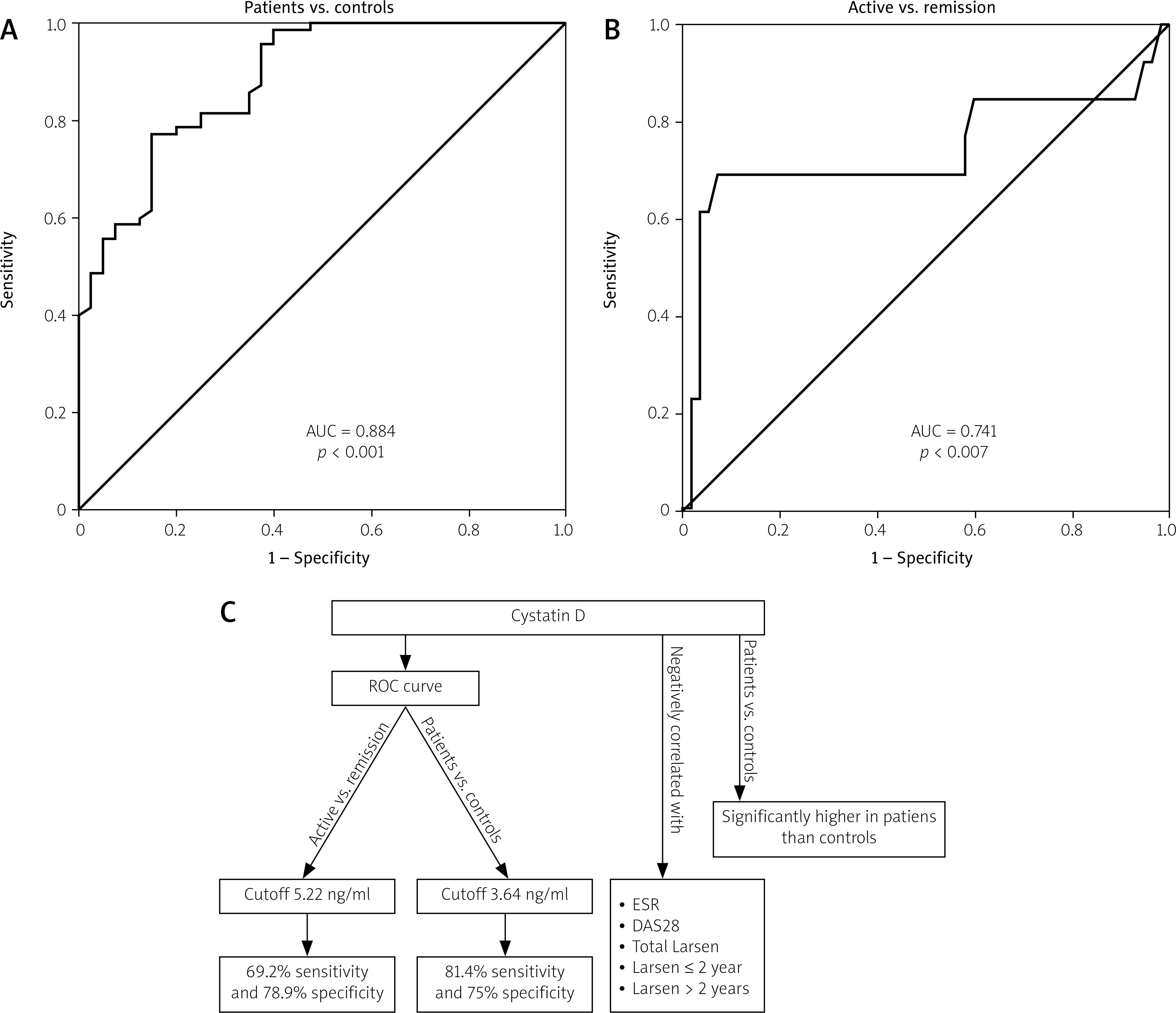 The receiver operating characteristic curve analysis showed that at a cutoff value of 3.64 ng/ml, cystatin D level could differentiate RA patients from healthy controls (p < 0.001) with 81.4% sensitivity and 75% specificity, and the area under the curve (AUC) was 0.884, as shown in Table V and Fig. 1A.