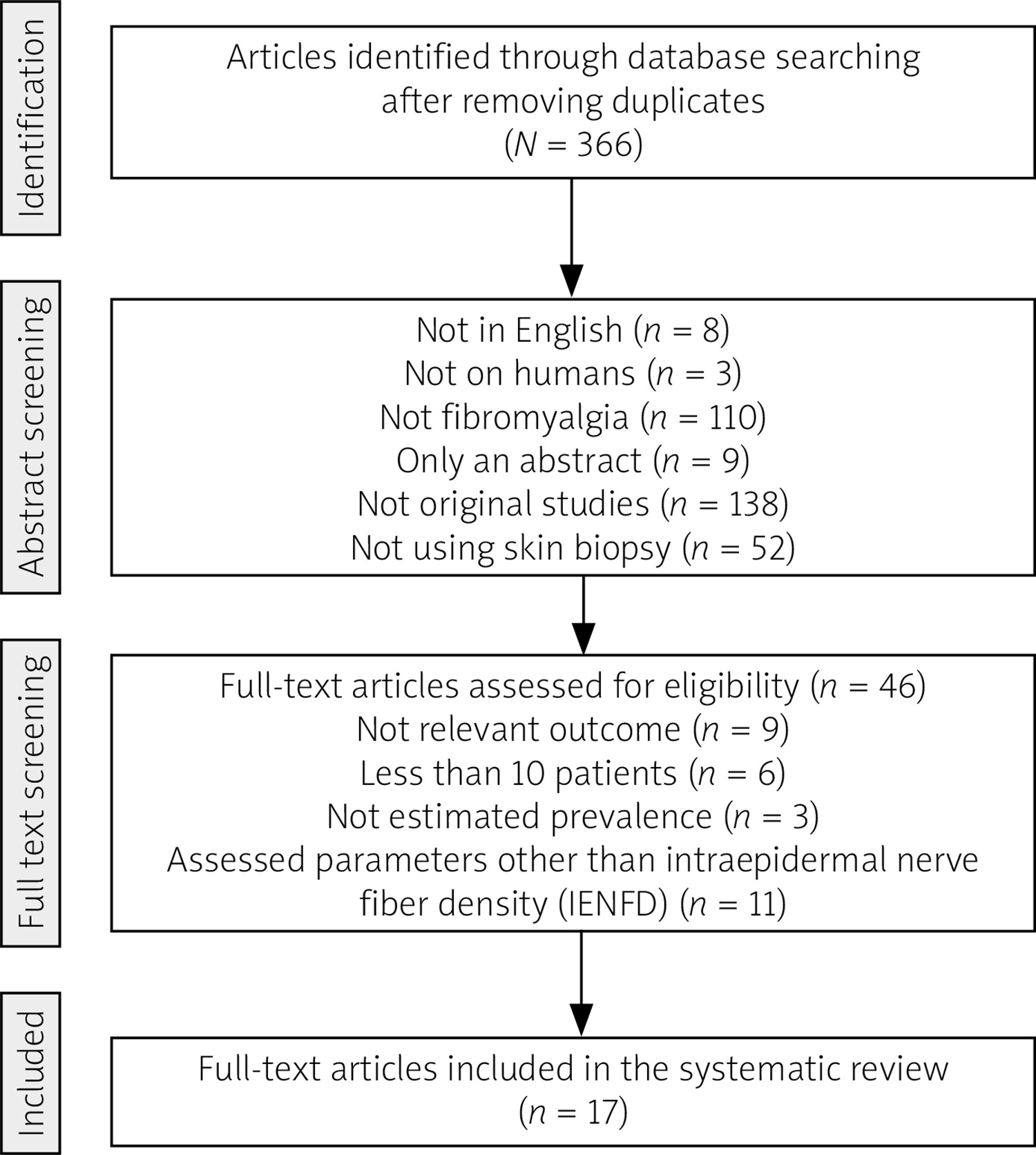 Inclusion criteria were: availability of full text, original research articles, application of skin biopsy as a diagnostic method, and assessment of IENFD. Exclusion criteria comprised studies not published in English, animal studies, studies focused on conditions other than fibromyalgia, and studies involving less than 10 patients.