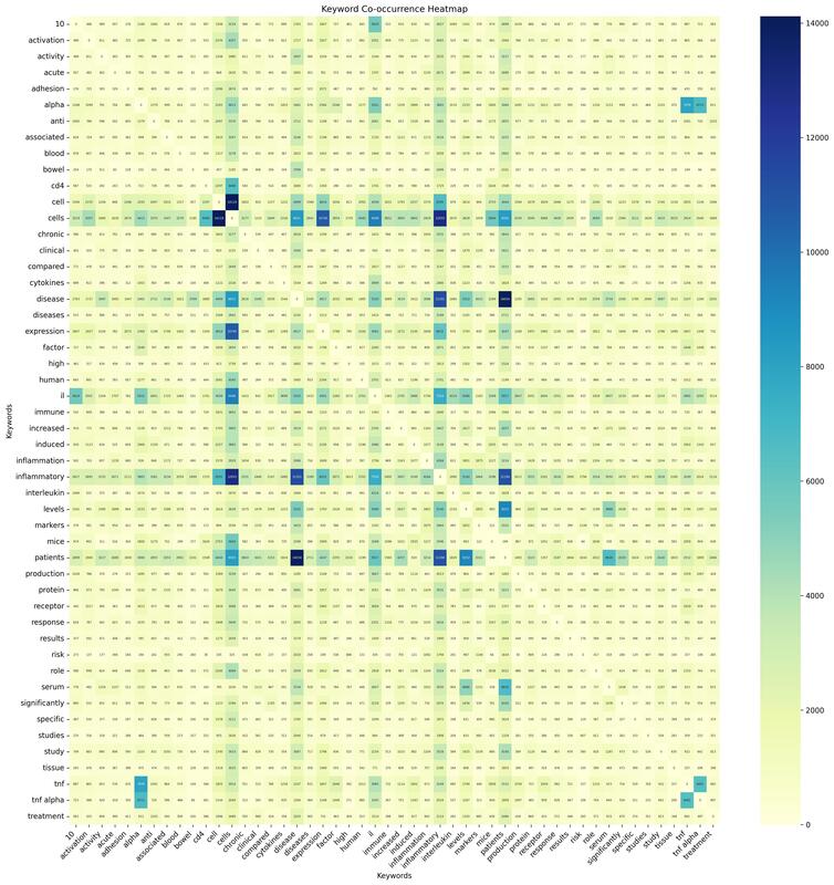 PubMed-indexed articles (n = 77,575) published from 1995 to 2024 were examined using Python (Version 3.10.5) in a PyCharm (Software Version 2022.1.3) environment. Titles, abstracts, and key words were preprocessed by removing stop words and symbols, and the 50 most frequent terms were extracted. A key word co-occurrence matrix was constructed to evaluate relationships between terms, and heatmaps were generated for visualization. To capture developmental stages, the dataset was divided into 3 periods (1995–2004, 2005–2014, 2015–2024), and thematic shifts were compared across intervals.