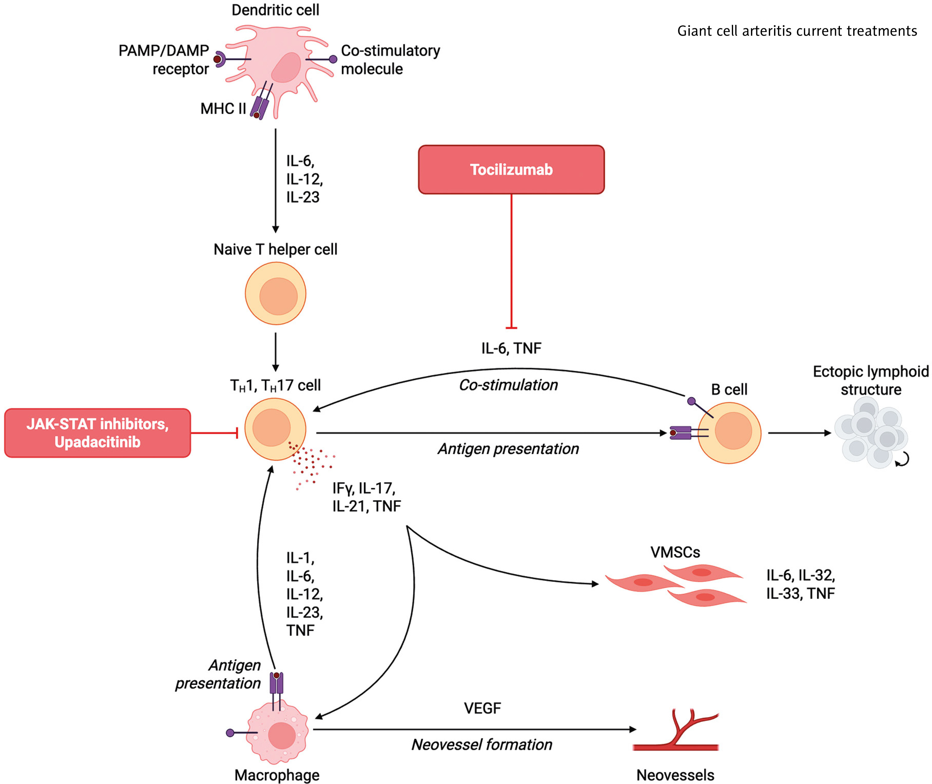 Mechanistically, the role of IL-6 and interferon-γ in GCA pathophysiology is well documented, with both signaling through the JAK-STAT (Janus kinase-signal transducer and activator of transcription) pathway (Fig. 1) [8, 9]. With this in mind, upadacitinib (UPA), an oral selective JAK1 inhibitor, represents a targeted therapeutic candidate for GC-sparing disease control. The SELECT-GCA trial, a multicenter randomized placebo-controlled study, recently confirmed the efficacy of UPA in patients with GCA [10]. The trial included patients over 50 years old, with a diagnosis of new-onset, or relapsing GCA, confirmed by imaging or biopsy. Participants were randomized to UPA 15 mg/day, UPA 7.5 mg/day, or placebo, combined with standardized GCs therapy. In the UPA arms, GCs were tapered over 26 weeks, while in the placebo arm, GCs were tapered over 52 weeks. The primary endpoints were sustained remission, defined as the absence of signs and symptoms of GCA from week 12 until week 52, and adherence to the protocol-specified GC tapering. Secondary outcomes included complete remission, disease flare-related endpoints, patient-reported outcome measures (PROMs), and cumulative exposure to GCs. The trial included 428 patients (70% newly diagnosed GCA), and at week 52 a total of 299 patients (69.9%) had completed the regimen. In the SELECT-GCA trial, UPA 15 mg administered with a 26-week GCs taper was superior to placebo plus a 52-week taper regarding sustained remission at week 52 (46.4% vs. 29.0%, p = 0.002). Furthermore, the UPA 15 mg arm received significantly less GCs. On the other hand, the UPA dose at 7.5 mg did not differ from placebo in sustaining remission (41.1% vs. 29.0%, respectively). It is important to note, however, that the definition of remission in GCA is not unanimous in trials, making interpretation of results and the incidence of adverse events difficult to compare between trials [11, 12].