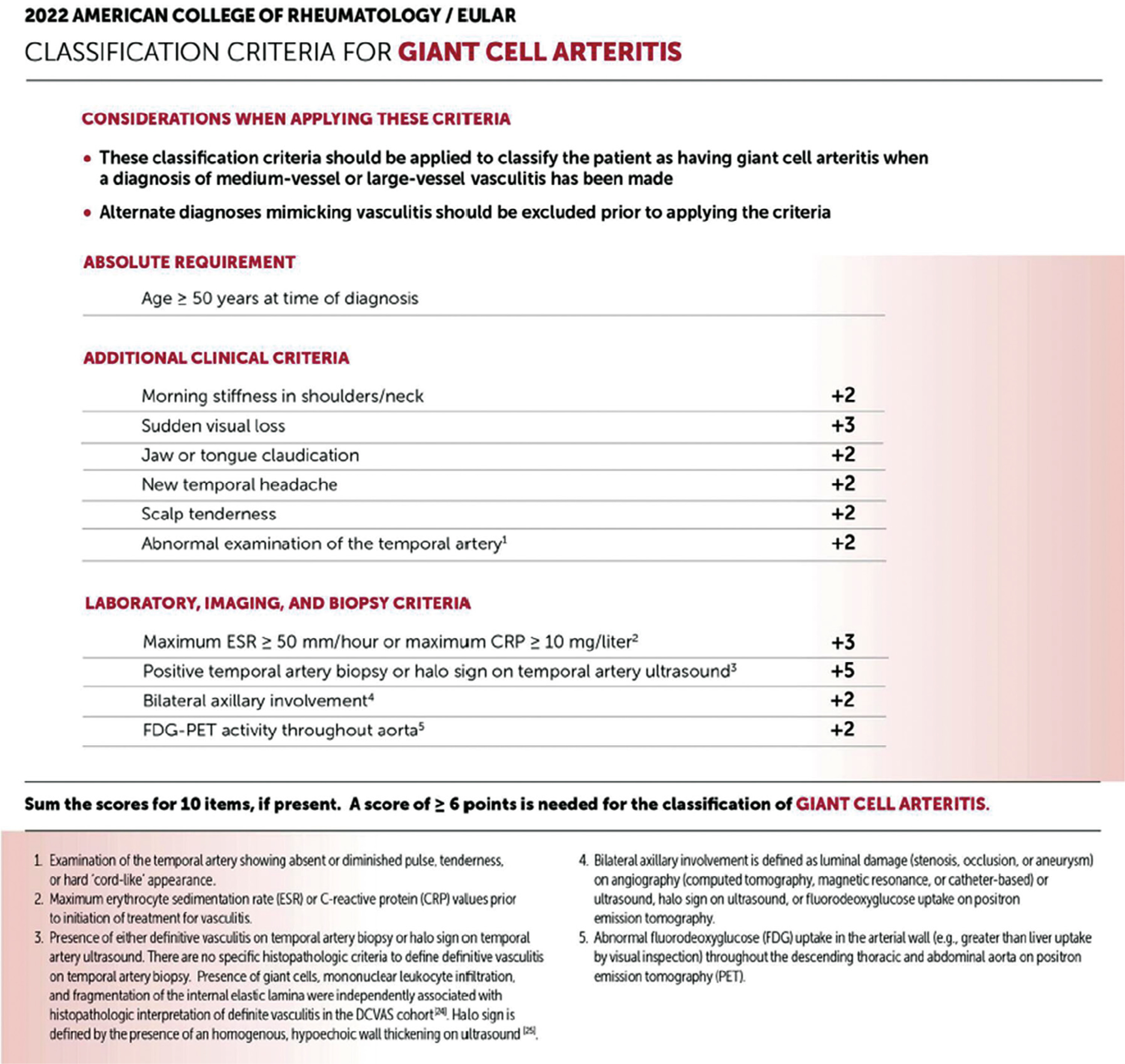 Source: Ponte C, Grayson PC, Robson JC, et al. 2022 American College of Rheumatology/EULAR Classification Criteria for Giant Cell Arteritis. Arthritis Rheumatol 2022; 74: 1881–1889, DOI: 10.1002/art.42325. A license to reprint the figure was obtained from the publisher of Arthritis & Rheumatology, John Wiley & Sons.