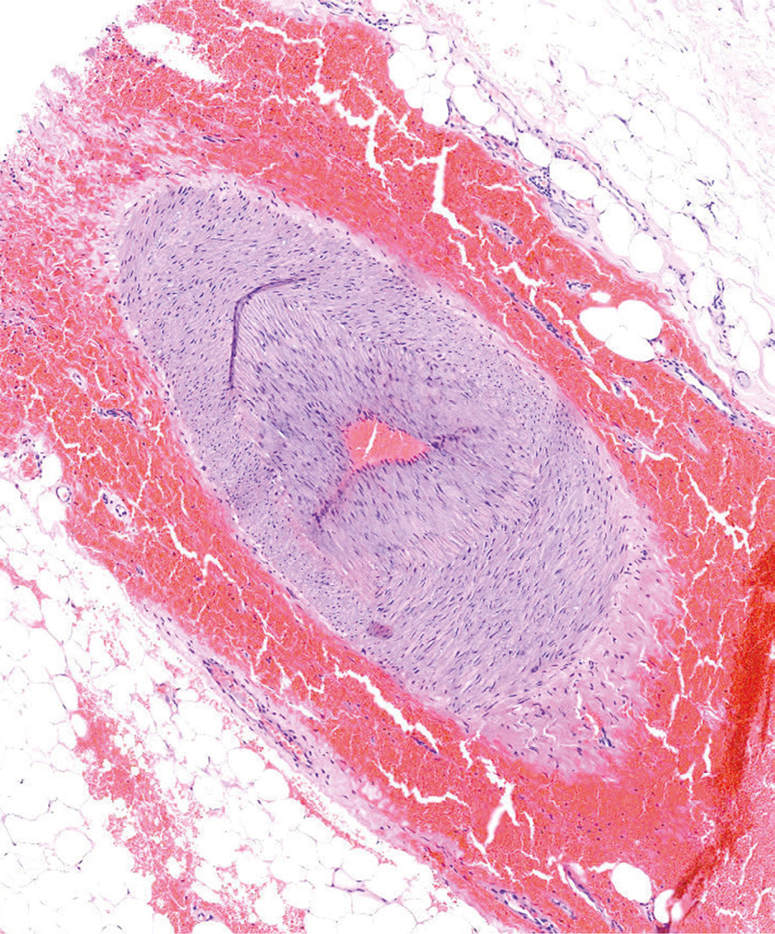 Microscopic image of giant cell arteritis. Biopsy specimen of the frontal branch of the left superficial temporal artery. Hematoxylin and eosin stain; objective: 10 ×.