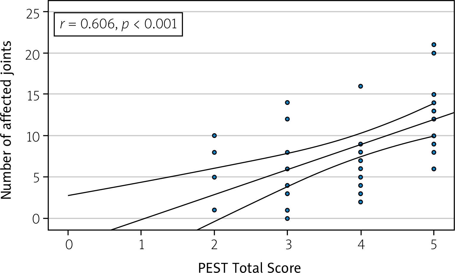 The correlation analysis indicates moderate to strong positive relationships between the total scores of PEST and EARP (Fig. 1), as well as between these scores and the number of affected joints (Figs. 2 and 3). Specifically, the PEST total score from the first assessment shows a moderate positive correlation with both the number of affected joints (r = 0.606, p < 0.001) (Fig. 2) and the EARP total score (r = 0.530, p < 0.001) (Fig. 1). Additionally, a strong positive correlation is observed between the number of affected joints and the EARP total score (r = 0.640, p < 0.001) (Fig. 3).