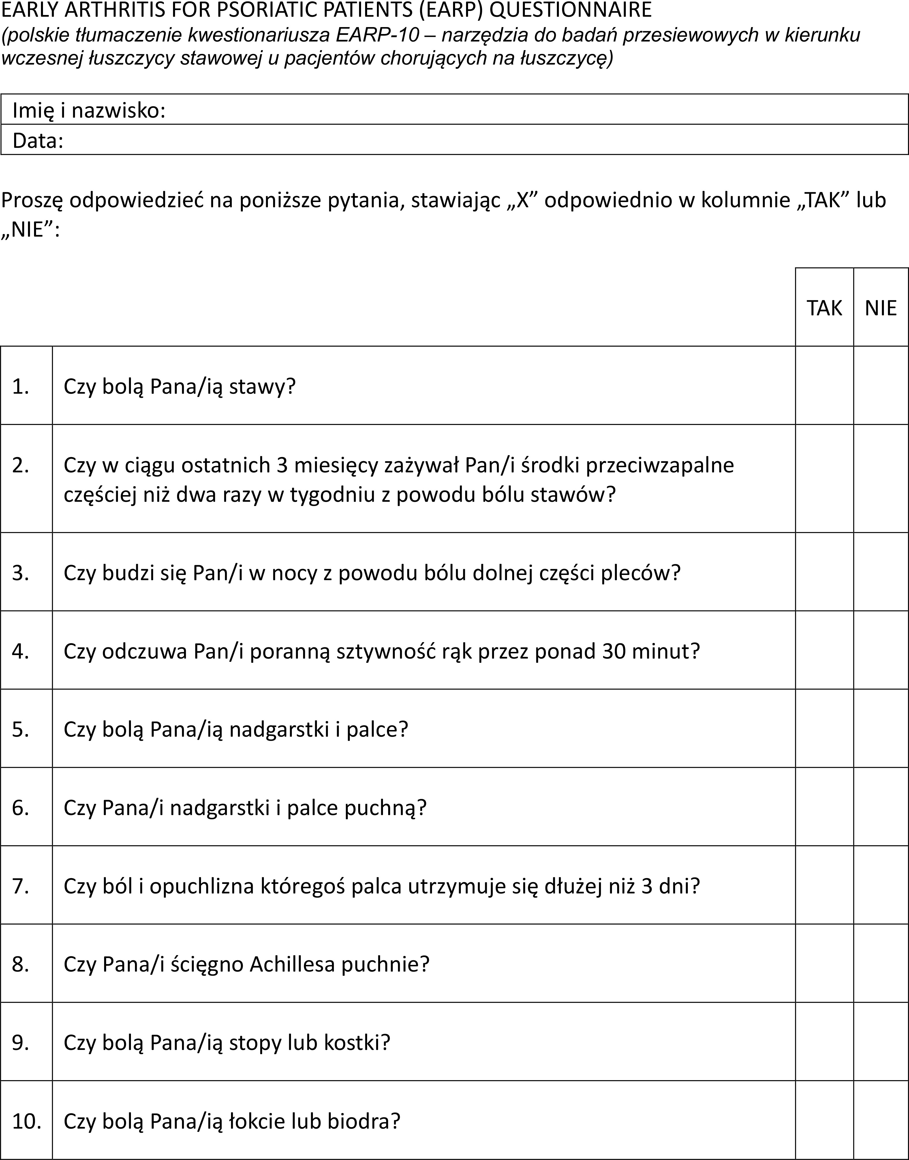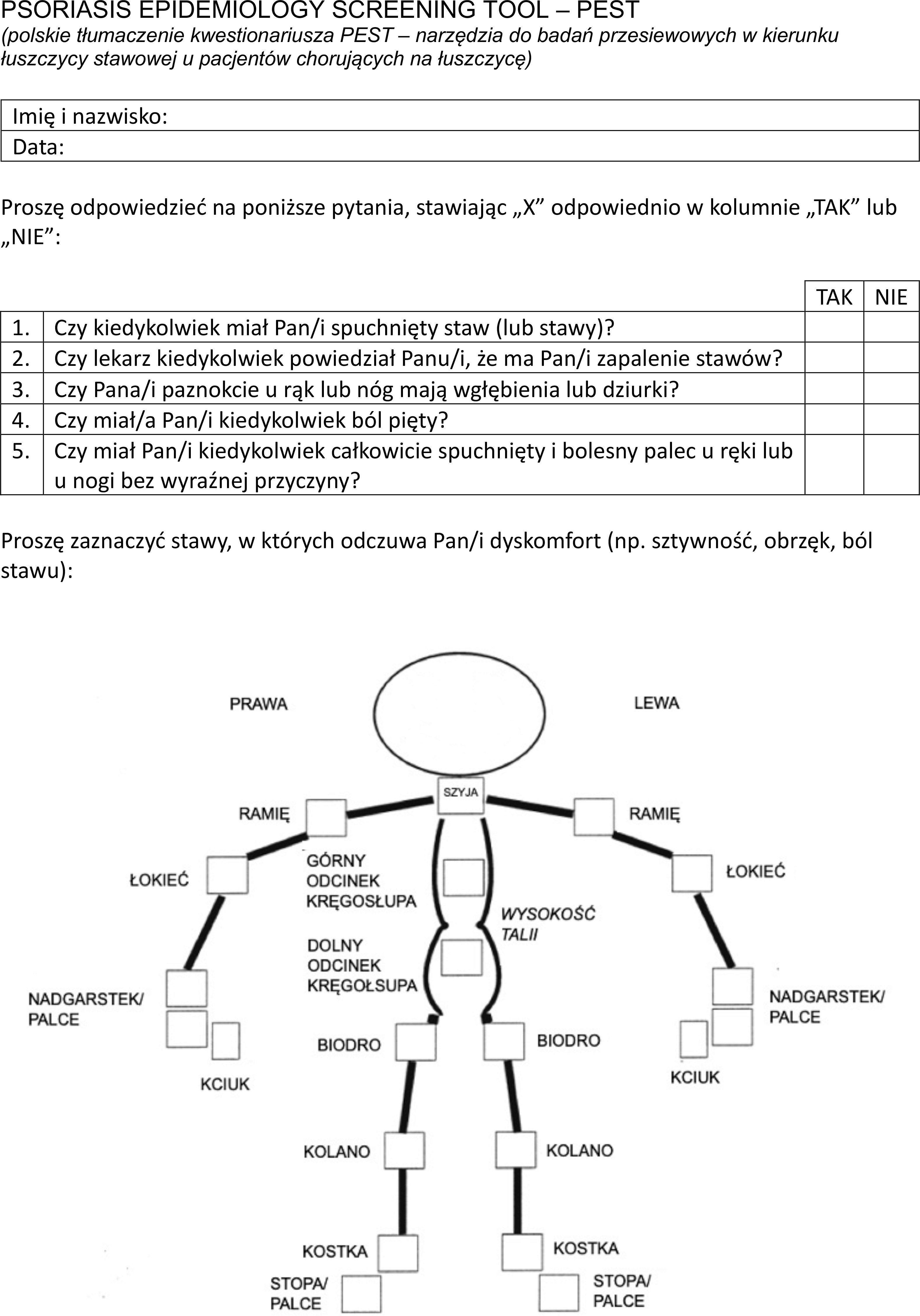 The Psoriasis Epidemiology Screening Tool (PEST) is a self-administered questionnaire consisting of 5 items, complemented by a figure for patients to mark areas of concern. PEST demonstrates a sensitivity of 92% and a specificity of 78% in patients with PsO. Each item in the questionnaire has a “Yes” or “No” answer, scored as 1 and 0 points, respectively. A total score of 3 points or higher indicates a positive result and suggests the need for further rheumatological evaluation. Although the manikin does not contribute to the discriminative ability of the questionnaire, it enables the physician to quickly identify affected joints. The figure does not enhance the diagnostic accuracy of the questionnaire; however, it provides valuable information for clinicians to efficiently identify affected joints, thereby facilitating the referral process when indicated [3]. Another tool, designed for early detection of PsA, is Early Arthritis for Psoriatic Patients (EARP), a straightforward 10-item questionnaire with a sensitivity of 85% and a high specificity of 92%. The EARP questionnaire includes questions about joint pain, stiffness, swelling, lower back pain, and other related signs. Each question has a “Yes” or “No” answer, scored as 1 and 0, respectively. The total score is calculated by summing positive answers, with a score of 3 points or higher indicating the need for further rheumatological evaluation. For patients scoring below 3 points but with persistent or worsening symptoms, it is recommended to consider reevaluating with EARP or consulting a specialist [4]. Until now, none of these tools has been officially available to the Polish population. The objective of this study was to translate and further validate the PEST and EARP questionnaires, creating a Polish-language version as a screening tool for identifying individuals with PsA in the Polish population.